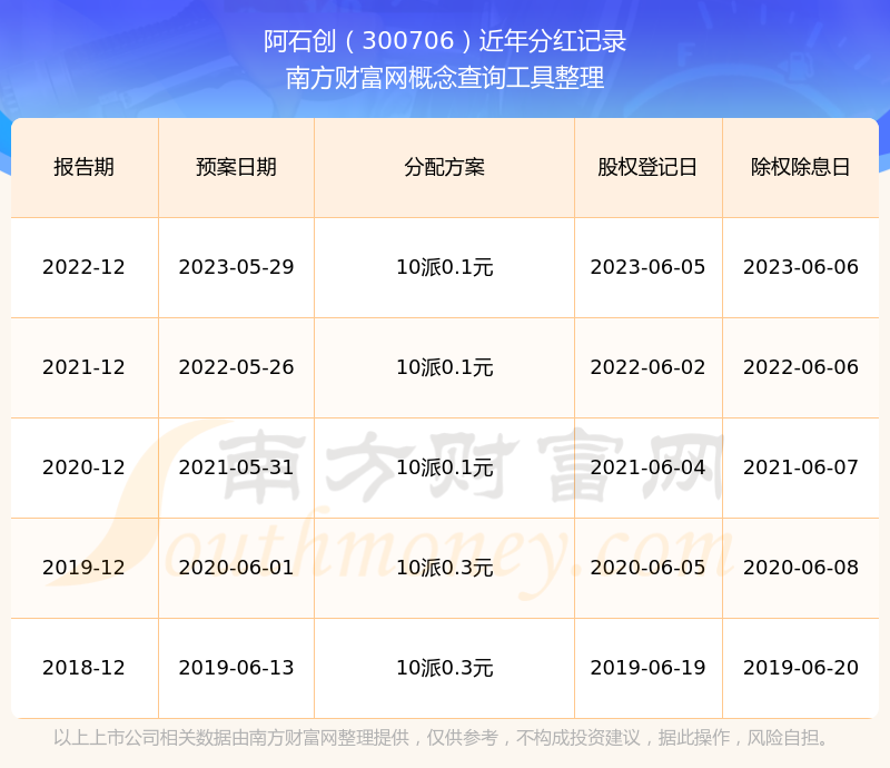 阿石創(chuàng)最新一次公布的分紅方案為10派0.1元。本次權(quán)益分派股權(quán)登記日為2023年6月5日,除權(quán)除息日為2023年6月6日,派息日為2023年6月6日。