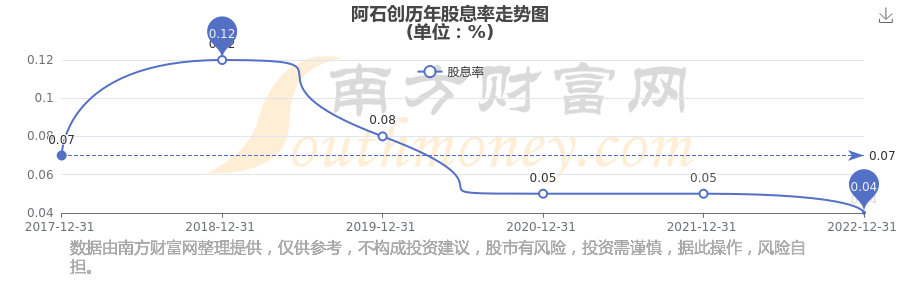 近年阿石創(chuàng)年度股息率走勢(shì)如下圖: