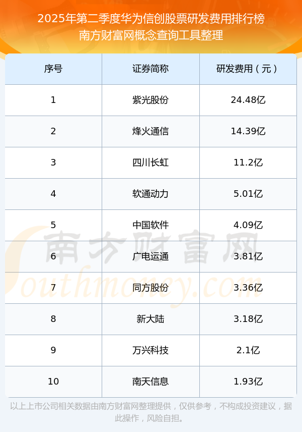 2025年第二季度,華為信創(chuàng)股票研發(fā)費(fèi)用排名如下:紫光股份(000938)研發(fā)費(fèi)用總額高達(dá)24.48億,烽火通信(600498)和四川長(zhǎng)虹(600839)分別位居第二和第三,軟通動(dòng)力(301236)、中國(guó)軟件(600536)、廣電運(yùn)通(002152)、同方股份(600100)、新大陸(000997)、萬興科技(300624)、南天信息(000948)分別進(jìn)入前十,其研發(fā)費(fèi)用總額分別排名第4-10名。