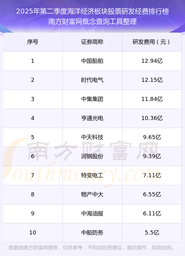2025年第二季度海洋經(jīng)濟(jì)板塊股票研發(fā)經(jīng)費(fèi)排行榜如下:中國(guó)船舶(600150)研發(fā)經(jīng)費(fèi)總額高達(dá)12.94億,時(shí)代電氣(688187)和中集集團(tuán)(000039)分別位居第二和第三,亨通光電(600487)、中天科技(600522)、河鋼股份(000709)、特變電工(600089)、物產(chǎn)中大(600704)、中海油服(601808)、中船防務(wù)(600685)分別進(jìn)入前十,其研發(fā)經(jīng)費(fèi)總額分別排名第4-10名。