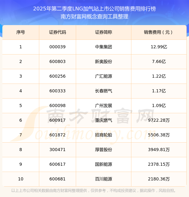 2025年第二季度,LNG加氣站上市公司銷售費(fèi)用排名中,中集集團(tuán)(000039)銷售費(fèi)用總額高達(dá)12.99億,新奧股份(600803)和廣匯能源(600256)排名第二和第三,長春燃?xì)猓?00333)、廣州發(fā)展(600098)、重慶燃?xì)猓?00917)、招商輪船(601872)、厚普股份(300471)、國新能源(600617)、百川能源(600681)進(jìn)入前十,銷售費(fèi)用總額分別排名第4-10名。