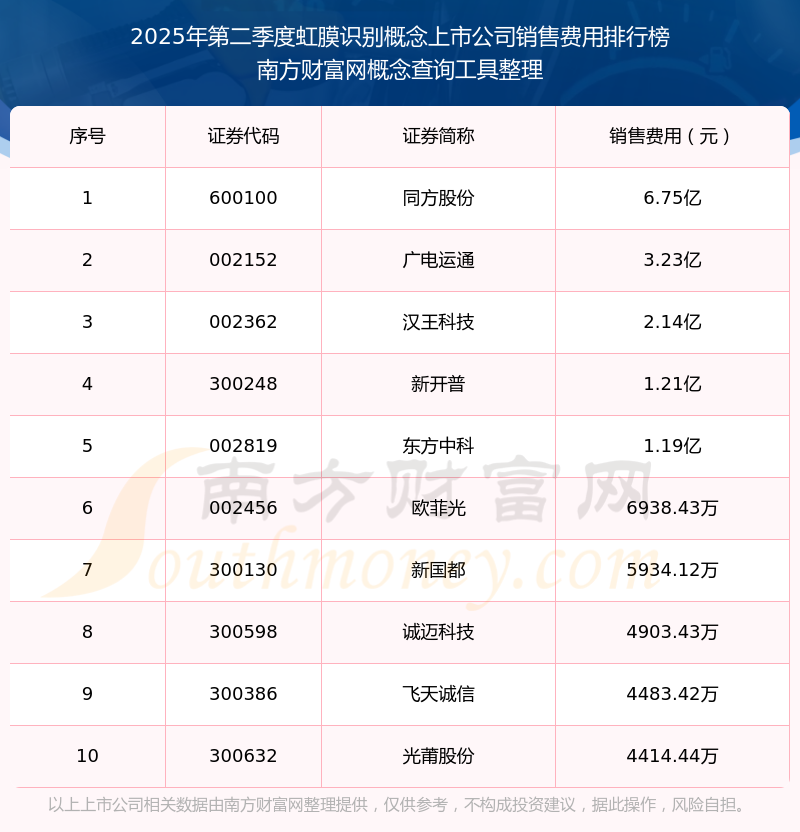 2025年第二季度,虹膜識(shí)別概念上市公司銷售費(fèi)用排名中,同方股份(600100)銷售費(fèi)用總額高達(dá)6.75億,廣電運(yùn)通(002152)和漢王科技(002362)排名第二和第三,新開(kāi)普(300248)、東方中科(002819)、歐菲光(002456)、新國(guó)都(300130)、誠(chéng)邁科技(300598)、飛天誠(chéng)信(300386)、光莆股份(300632)進(jìn)入前十,銷售費(fèi)用總額分別排名第4-10名。