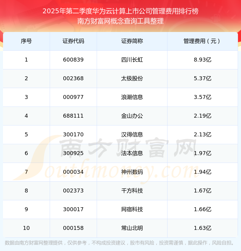 2025年第二季度,華為云計(jì)算上市公司管理費(fèi)用排名中,四川長(zhǎng)虹(600839)的管理費(fèi)用總額高達(dá)8.93億,太極股份(002368)和浪潮信息(000977)排名第二和第三,金山辦公(688111)、漢得信息(300170)、法本信息(300925)、神州數(shù)碼(000034)、千方科技(002373)、網(wǎng)宿科技(300017)、常山北明(000158)進(jìn)入前十,其管理費(fèi)用總額分別排名第4-10名。
