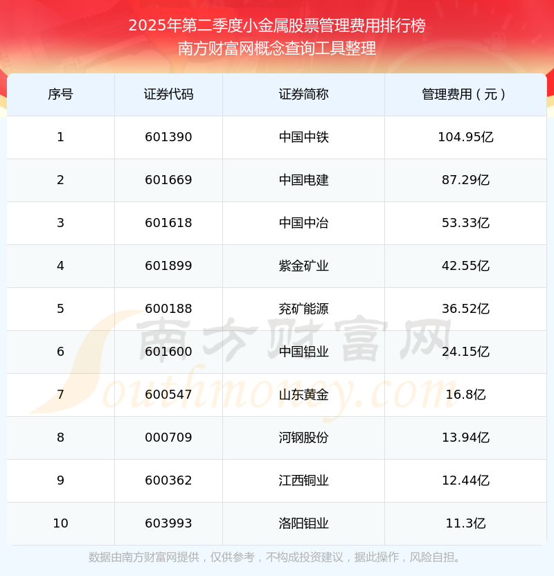 2025年第二季度,小金屬股票管理費(fèi)用排行榜如下:中國(guó)中鐵(601390)的管理費(fèi)用總額高達(dá)104.95億,中國(guó)電建(601669)和中國(guó)中冶(601618)分別排名第二和第三,紫金礦業(yè)(601899)、兗礦能源(600188)、中國(guó)鋁業(yè)(601600)、山東黃金(600547)、河鋼股份(000709)、江西銅業(yè)(600362)、洛陽(yáng)鉬業(yè)(603993)分別進(jìn)入前十,其管理費(fèi)用總額分別排名第4-10名。