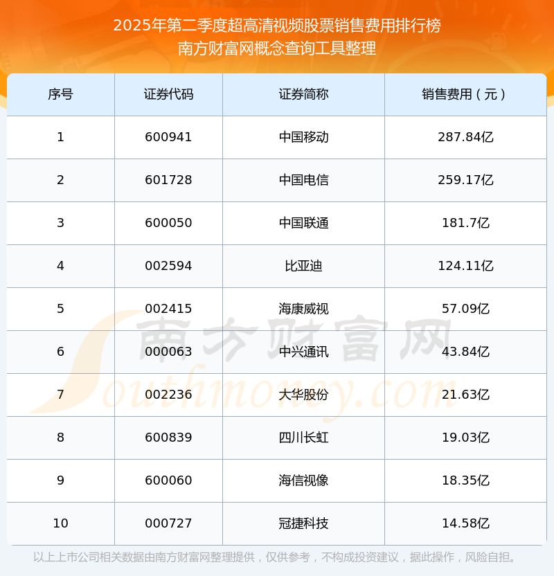 2025年第二季度超高清視頻股票銷售費(fèi)用排行榜如下:中國移動(dòng)(600941)的銷售費(fèi)用總額高達(dá)287.84億,中國電信(601728)和中國聯(lián)通(600050)分別位居第二和第三,比亞迪(002594)、海康威視(002415)、中興通訊(000063)、大華股份(002236)、四川長虹(600839)、海信視像(600060)、冠捷科技(000727)分別進(jìn)入前十,其銷售費(fèi)用總額分別排名第4-10名。