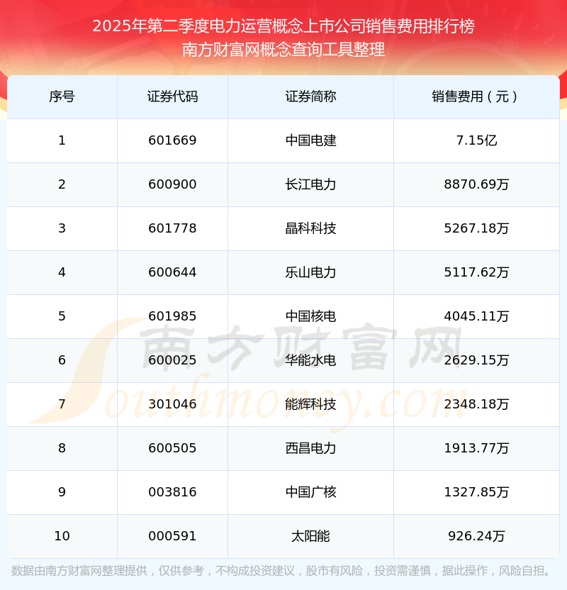 2025年第二季度,電力運營概念上市公司銷售費用排名中,中國電建(601669)銷售費用總額高達7.15億,長江電力(600900)和晶科科技(601778)排名第二和第三,樂山電力(600644)、中國核電(601985)、華能水電(600025)、能輝科技(301046)、西昌電力(600505)、中國廣核(003816)、太陽能(000591)進入前十,銷售費用總額分別排名第4-10名。