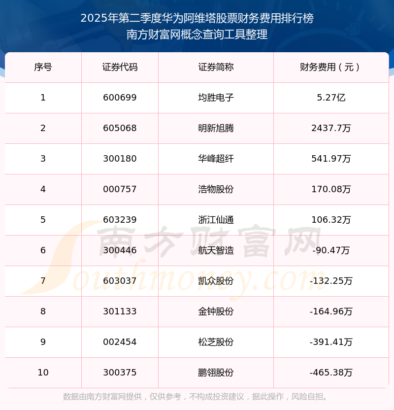 2025年第二季度華為阿維塔股票財務(wù)費用排行榜如下:均勝電子(600699)的財務(wù)費用總額高達(dá)5.27億,明新旭騰(605068)和華峰超纖(300180)分別位居第二和第三,浩物股份(000757)、浙江仙通(603239)、航天智造(300446)、凱眾股份(603037)、金鐘股份(301133)、松芝股份(002454)、鵬翎股份(300375)分別進(jìn)入前十,其財務(wù)費用總額分別排名第4-10名。