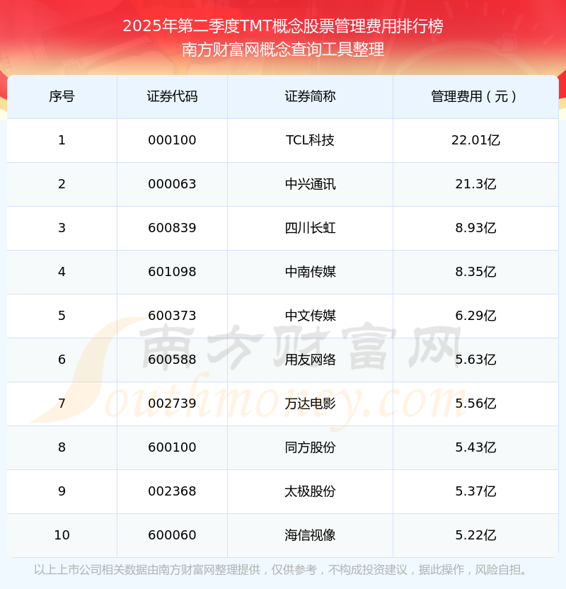 2025年第二季度,TMT概念股票管理費用排名如下:TCL科技(000100)的管理費用總額高達(dá)22.01億,中興通訊(000063)和四川長虹(600839)位居第二和第三,中南傳媒(601098)、中文傳媒(600373)、用友網(wǎng)絡(luò)(600588)、萬達(dá)電影(002739)、同方股份(600100)、太極股份(002368)、海信視像(600060)分別進(jìn)入前十,其管理費用總額分別排名第4-10名。