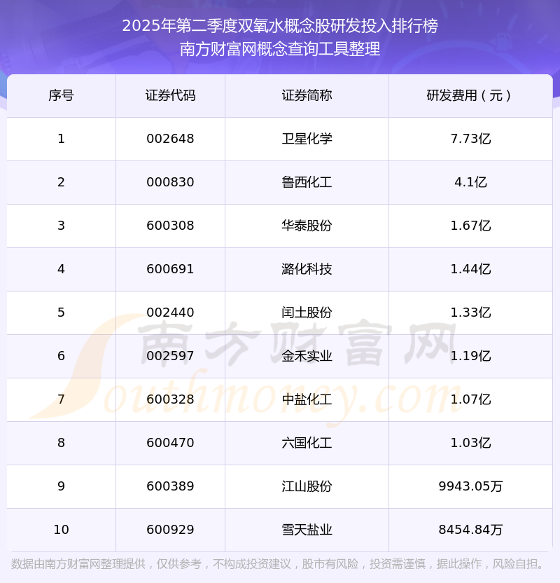 2025年第二季度,雙氧水概念股研發(fā)投入排行榜中,衛(wèi)星化學(xué)(002648)研發(fā)投入總額高達(dá)7.73億,魯西化工(000830)和華泰股份(600308)排名第二和第三,潞化科技(600691)、閏土股份(002440)、金禾實(shí)業(yè)(002597)、中鹽化工(600328)、六國化工(600470)、江山股份(600389)、雪天鹽業(yè)(600929)進(jìn)入前十,研發(fā)投入總額分別排名第4-10名。