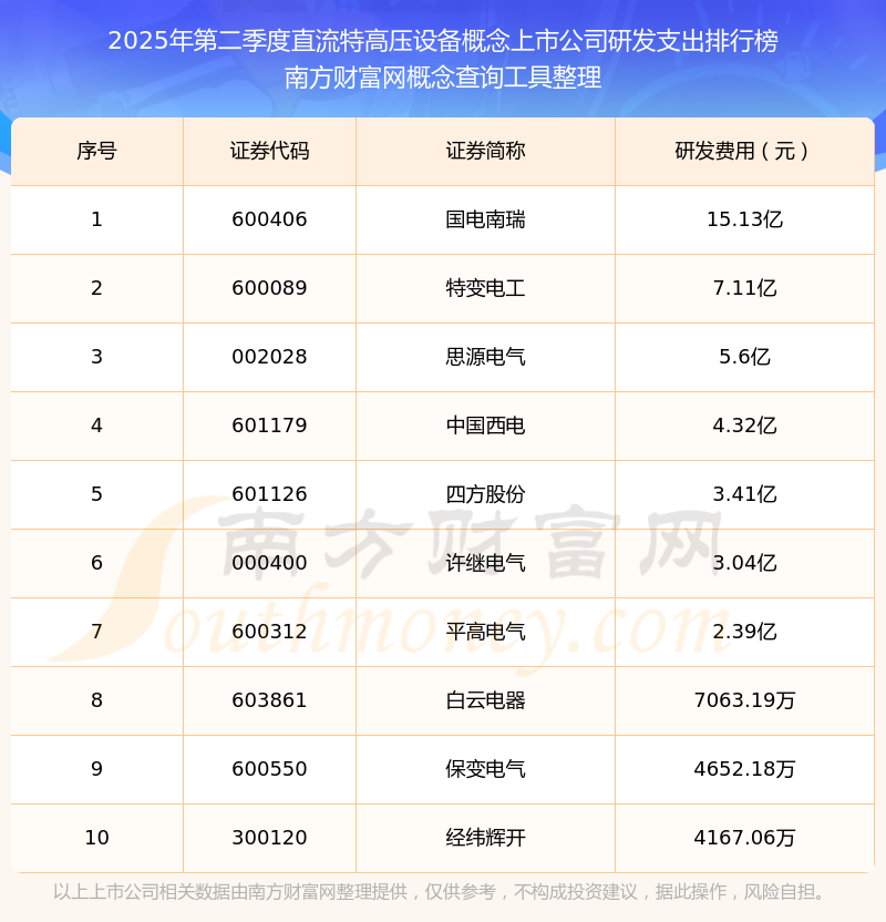 2025年第二季度直流特高壓設(shè)備概念上市公司研發(fā)支出排行榜如下:國(guó)電南瑞(600406)研發(fā)支出總額高達(dá)15.13億,特變電工(600089)和思源電氣(002028)分別位居第二和第三,中國(guó)西電(601179)、四方股份(601126)、許繼電氣(000400)、平高電氣(600312)、白云電器(603861)、保變電氣(600550)、經(jīng)緯輝開(300120)分別進(jìn)入前十,其研發(fā)支出總額分別排名第4-10名。