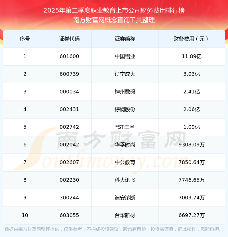 2025年第二季度,職業(yè)教育上市公司財(cái)務(wù)費(fèi)用排行榜中,中國(guó)鋁業(yè)(601600)財(cái)務(wù)費(fèi)用總額高達(dá)11.89億,遼寧成大(600739)和神州數(shù)碼(000034)位居第二和第三,棕櫚股份(002431)、*ST三圣(002742)、華孚時(shí)尚(002042)、中公教育(002607)、科大訊飛(002230)、迪安診斷(300244)、臺(tái)華新材(603055)進(jìn)入前十,財(cái)務(wù)費(fèi)用總額分別排名第4-10名。