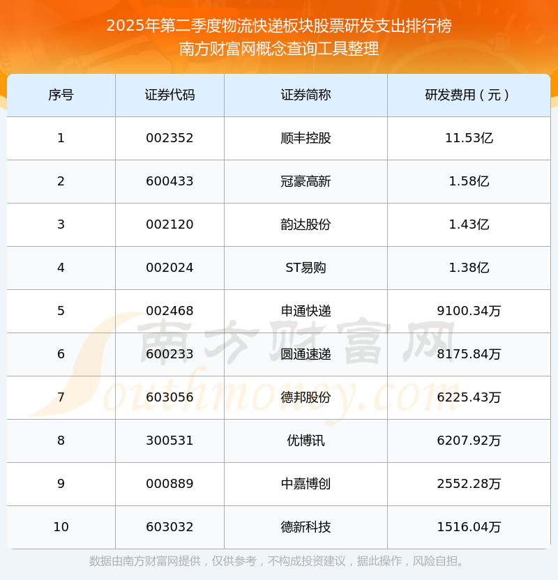 2025年第二季度,物流快遞板塊股票研發(fā)支出排行榜中,順豐控股(002352)研發(fā)支出總額高達11.53億,冠豪高新(600433)和韻達股份(002120)排名第二和第三,ST易購(002024)、申通快遞(002468)、圓通速遞(600233)、德邦股份(603056)、優(yōu)博訊(300531)、中嘉博創(chuàng)(000889)、德新科技(603032)進入前十,研發(fā)支出總額分別排名第4-10名。