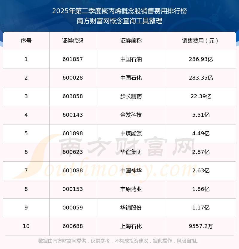 2025年第二季度,聚丙烯概念股銷(xiāo)售費(fèi)用排名中,中國(guó)石油(601857)銷(xiāo)售費(fèi)用總額高達(dá)286.93億,中國(guó)石化(600028)和步長(zhǎng)制藥(603858)排名第二和第三,金發(fā)科技(600143)、中煤能源(601898)、華誼集團(tuán)(600623)、中國(guó)神華(601088)、豐原藥業(yè)(000153)、華錦股份(000059)、上海石化(600688)進(jìn)入前十,銷(xiāo)售費(fèi)用總額分別排名第4-10名。