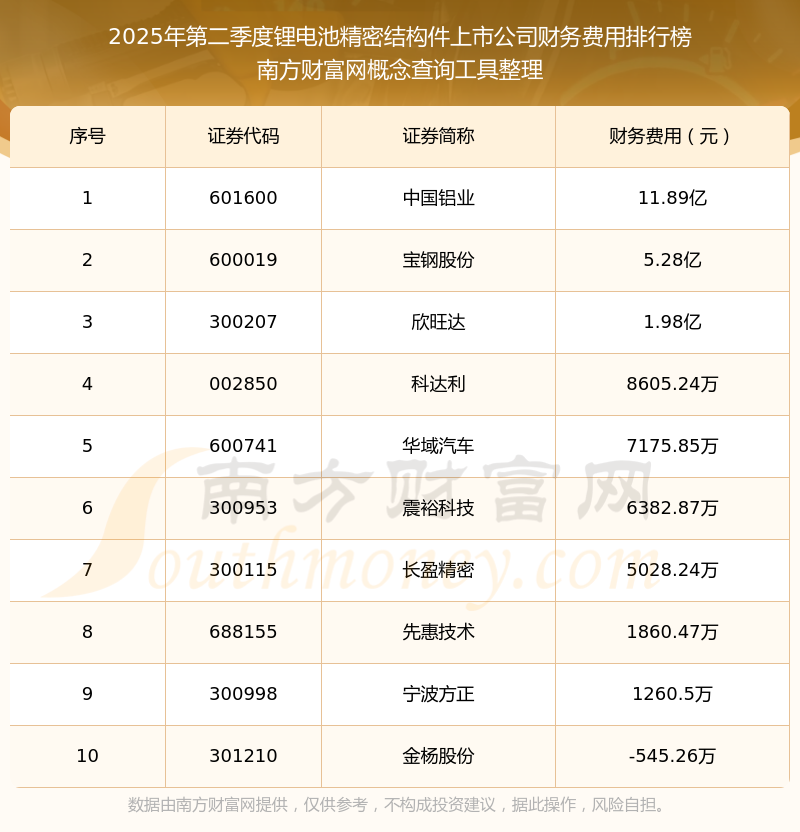2025年第二季度鋰電池精密結(jié)構(gòu)件上市公司財(cái)務(wù)費(fèi)用排行榜如下:中國(guó)鋁業(yè)(601600)的財(cái)務(wù)費(fèi)用總額高達(dá)11.89億,寶鋼股份(600019)和欣旺達(dá)(300207)分別排名第二和第三,科達(dá)利(002850)、華域汽車(chē)(600741)、震?萍迹300953)、長(zhǎng)盈精密(300115)、先惠技術(shù)(688155)、寧波方正(300998)、金楊股份(301210)分別進(jìn)入前十,其財(cái)務(wù)費(fèi)用總額分別排名第4-10名。