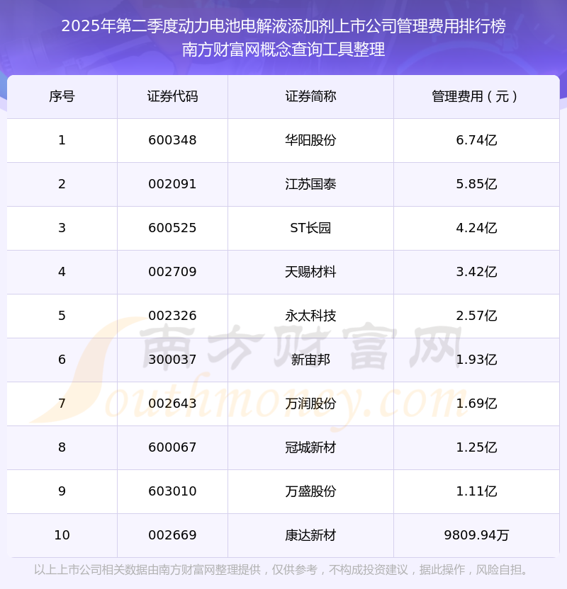 2025年第二季度,動(dòng)力電池電解液添加劑上市公司管理費(fèi)用排名中,華陽(yáng)股份(600348)的管理費(fèi)用總額高達(dá)6.74億,江蘇國(guó)泰(002091)和ST長(zhǎng)園(600525)排名第二和第三,天賜材料(002709)、永太科技(002326)、新宙邦(300037)、萬潤(rùn)股份(002643)、冠城新材(600067)、萬盛股份(603010)、康達(dá)新材(002669)進(jìn)入前十,其管理費(fèi)用總額分別排名第4-10名。