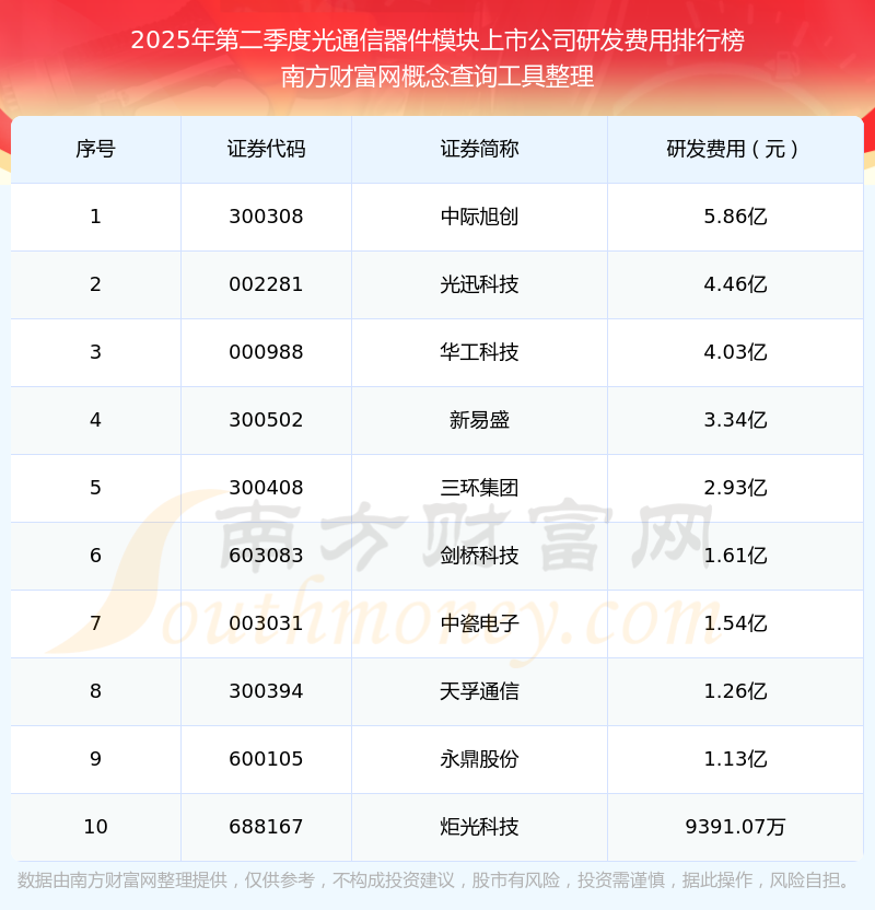 2025年第二季度光通信器件模塊上市公司研發(fā)費(fèi)用排行榜如下:中際旭創(chuàng)(300308)研發(fā)費(fèi)用總額高達(dá)5.86億,光迅科技(002281)和華工科技(000988)分別排名第二和第三,新易盛(300502)、三環(huán)集團(tuán)(300408)、劍橋科技(603083)、中瓷電子(003031)、天孚通信(300394)、永鼎股份(600105)、炬光科技(688167)分別進(jìn)入前十,其研發(fā)費(fèi)用總額分別排名第4-10名。