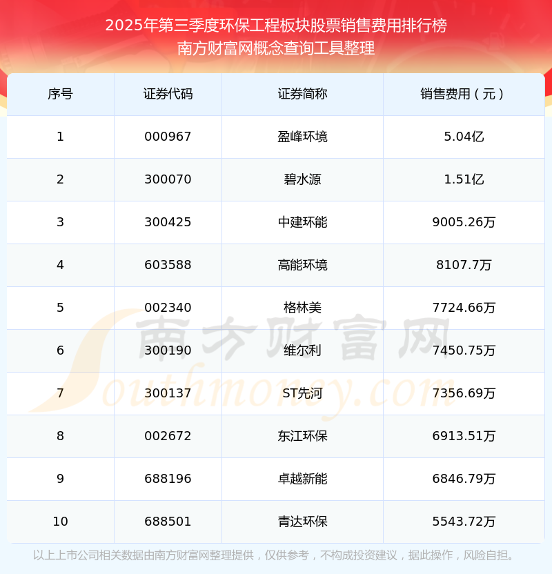 2025年第三季度,環(huán)保工程板塊股票銷售費(fèi)用排行榜中,盈峰環(huán)境(000967)銷售費(fèi)用總額高達(dá)5.04億,碧水源(300070)和中建環(huán)能(300425)位居第二和第三,高能環(huán)境(603588)、格林美(002340)、維爾利(300190)、ST先河(300137)、東江環(huán)保(002672)、卓越新能(688196)、青達(dá)環(huán)保(688501)進(jìn)入前十,銷售費(fèi)用總額分別排名第4-10名。