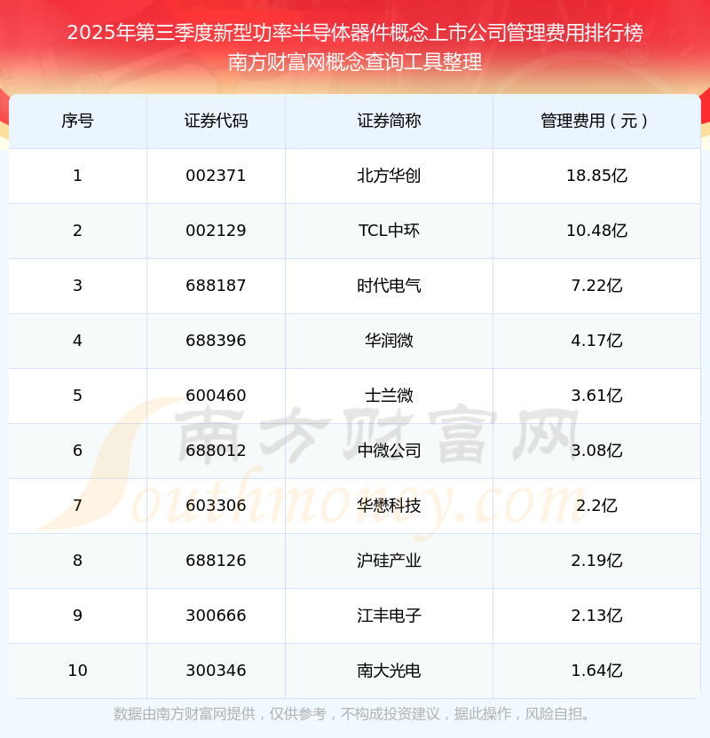 2025年第三季度,新型功率半導體器件概念上市公司管理費用排行榜如下:北方華創(chuàng)(002371)的管理費用總額高達18.85億,TCL中環(huán)(002129)和時代電氣(688187)分別排名第二和第三,華潤微(688396)、士蘭微(600460)、中微公司(688012)、華懋科技(603306)、滬硅產業(yè)(688126)、江豐電子(300666)、南大光電(300346)分別進入前十,其管理費用總額分別排名第4-10名。