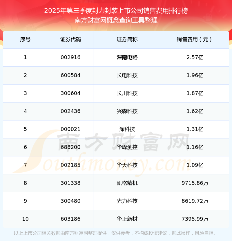 2025年第三季度,封力封裝上市公司銷售費(fèi)用排行榜如下:深南電路(002916)的銷售費(fèi)用總額高達(dá)2.57億,長(zhǎng)電科技(600584)和長(zhǎng)川科技(300604)分別位居第二和第三,興森科技(002436)、深科技(000021)、華峰測(cè)控(688200)、華天科技(002185)、凱格精機(jī)(301338)、光力科技(300480)、華正新材(603186)分別進(jìn)入前十,其銷售費(fèi)用總額分別排名第4-10名。