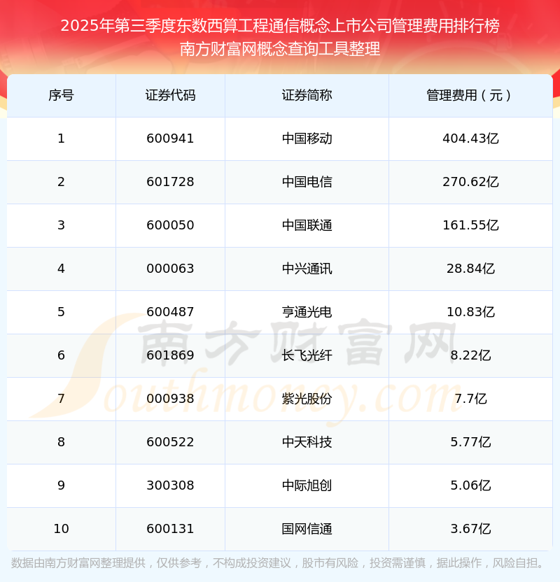 2025年第三季度,東數(shù)西算工程通信概念上市公司管理費(fèi)用排名如下:中國移動(dòng)(600941)的管理費(fèi)用總額高達(dá)404.43億,中國電信(601728)和中國聯(lián)通(600050)位居第二和第三,中興通訊(000063)、亨通光電(600487)、長飛光纖(601869)、紫光股份(000938)、中天科技(600522)、中際旭創(chuàng)(300308)、國網(wǎng)信通(600131)分別進(jìn)入前十,其管理費(fèi)用總額分別排名第4-10名。
