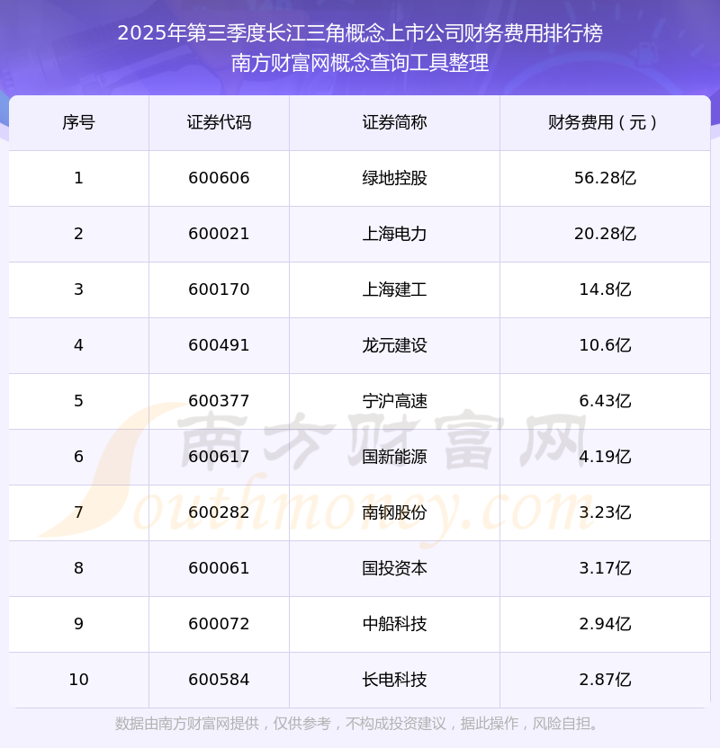 2025年第三季度長江三角概念上市公司財務(wù)費用排行榜如下:綠地控股(600606)的財務(wù)費用總額高達(dá)56.28億,上海電力(600021)和上海建工(600170)分別位居第二和第三,龍元建設(shè)(600491)、寧滬高速(600377)、國新能源(600617)、南鋼股份(600282)、國投資本(600061)、中船科技(600072)、長電科技(600584)分別進(jìn)入前十,其財務(wù)費用總額分別排名第4-10名。