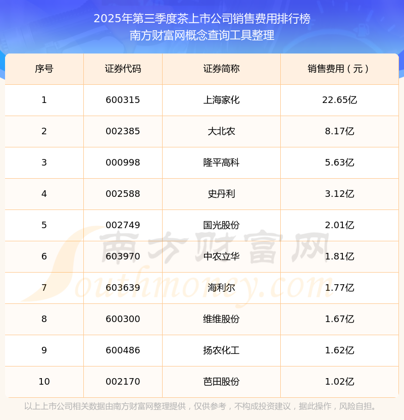 2025年第三季度茶上市公司銷售費用排行榜如下:上海家化(600315)的銷售費用總額高達22.65億,大北農(nóng)(002385)和隆平高科(000998)分別位居第二和第三,史丹利(002588)、國光股份(002749)、中農(nóng)立華(603970)、海利爾(603639)、維維股份(600300)、揚農(nóng)化工(600486)、芭田股份(002170)分別進入前十,其銷售費用總額分別排名第4-10名。