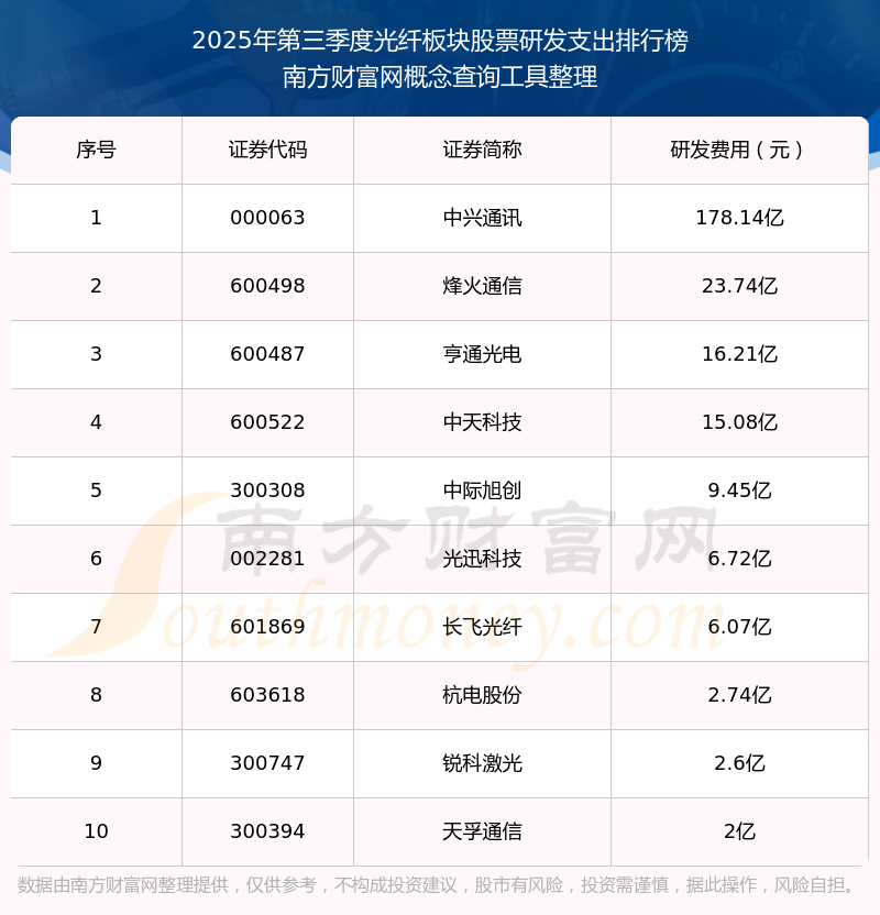 2025年第三季度光纖板塊股票研發(fā)支出排行榜如下:中興通訊(000063)研發(fā)支出總額高達(dá)178.14億,烽火通信(600498)和亨通光電(600487)分別位居第二和第三,中天科技(600522)、中際旭創(chuàng)(300308)、光迅科技(002281)、長(zhǎng)飛光纖(601869)、杭電股份(603618)、銳科激光(300747)、天孚通信(300394)分別進(jìn)入前十,其研發(fā)支出總額分別排名第4-10名。