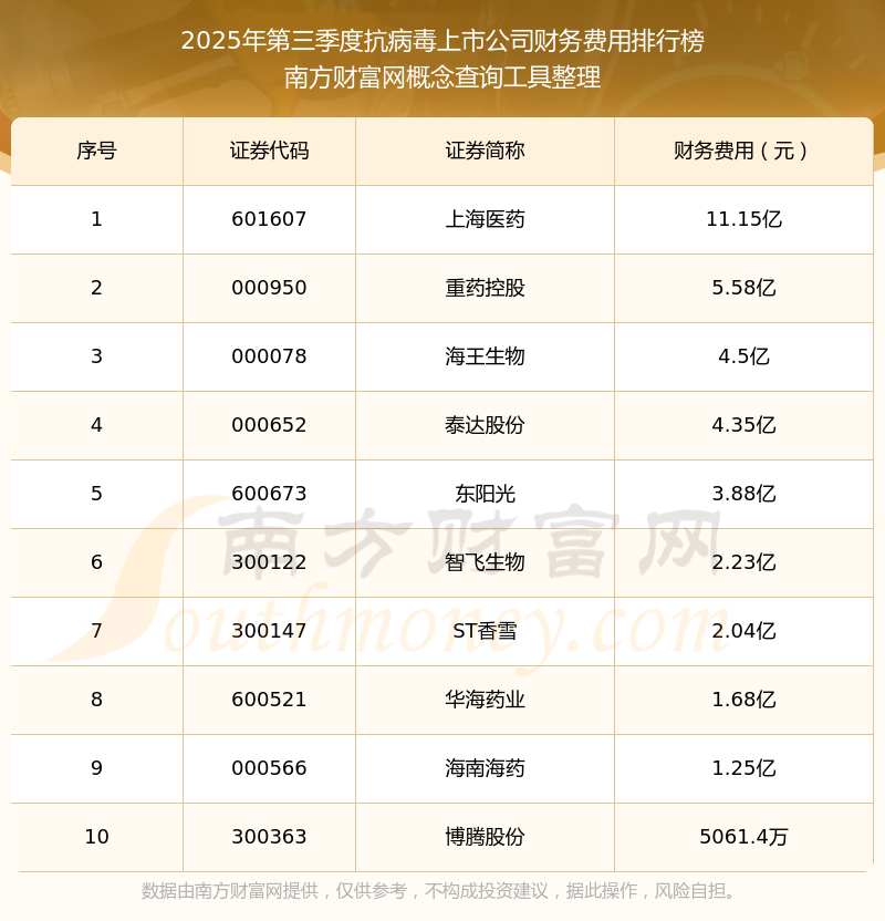 2025年第三季度,抗病毒上市公司財(cái)務(wù)費(fèi)用排名如下:上海醫(yī)藥(601607)的財(cái)務(wù)費(fèi)用總額高達(dá)11.15億,重藥控股(000950)和海王生物(000078)分別位居第二和第三,泰達(dá)股份(000652)、東陽光(600673)、智飛生物(300122)、ST香雪(300147)、華海藥業(yè)(600521)、海南海藥(000566)、博騰股份(300363)分別進(jìn)入前十,其財(cái)務(wù)費(fèi)用總額分別排名第4-10名。