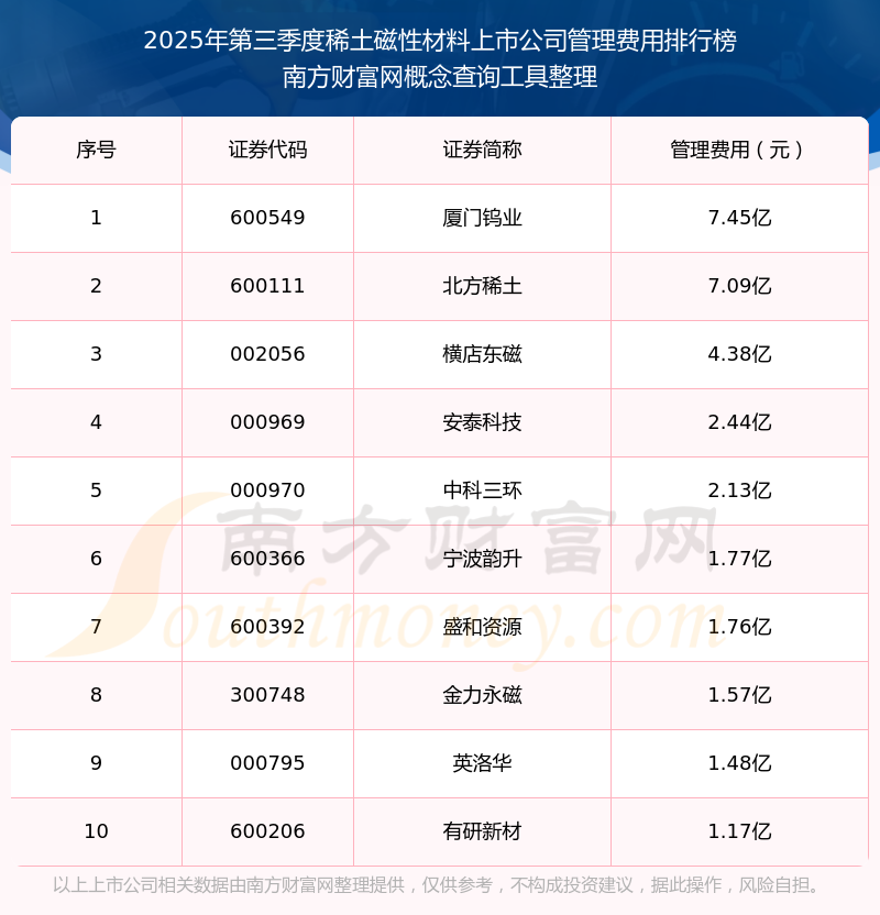 2025年第三季度,稀土磁性材料上市公司管理費用排名中,廈門鎢業(yè)(600549)的管理費用總額高達(dá)7.45億,北方稀土(600111)和橫店東磁(002056)排名第二和第三,安泰科技(000969)、中科三環(huán)(000970)、寧波韻升(600366)、盛和資源(600392)、金力永磁(300748)、英洛華(000795)、有研新材(600206)進入前十,其管理費用總額分別排名第4-10名。
