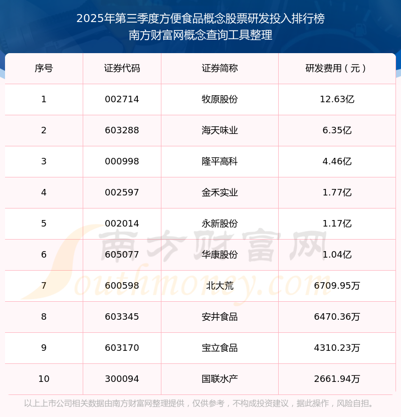 2025年第三季度方便食品概念股票研發(fā)投入排行榜如下:牧原股份(002714)研發(fā)投入總額高達(dá)12.63億,海天味業(yè)(603288)和隆平高科(000998)分別排名第二和第三,金禾實(shí)業(yè)(002597)、永新股份(002014)、華康股份(605077)、北大荒(600598)、安井食品(603345)、寶立食品(603170)、國(guó)聯(lián)水產(chǎn)(300094)分別進(jìn)入前十,其研發(fā)投入總額分別排名第4-10名。