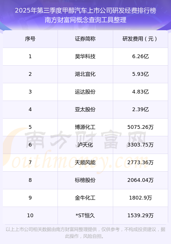 2025年第三季度,甲醇汽車上市公司研發(fā)經(jīng)費(fèi)排行榜中,昊華科技(600378)研發(fā)經(jīng)費(fèi)總額高達(dá)6.26億,湖北宜化(000422)和運(yùn)達(dá)股份(300772)排名第二和第三,亞太股份(002284)、博源化工(000683)、瀘天化(000912)、天順風(fēng)能(002531)、標(biāo)榜股份(301181)、金牛化工(600722)、*ST恒久(002808)進(jìn)入前十,研發(fā)經(jīng)費(fèi)總額分別排名第4-10名。