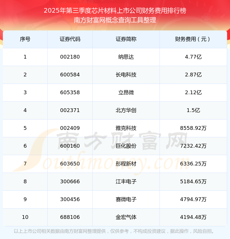 2025年第三季度芯片材料上市公司財務費用排行榜如下:納思達(002180)的財務費用總額高達4.77億,長電科技(600584)和立昂微(605358)分別位居第二和第三,北方華創(chuàng)(002371)、雅克科技(002409)、巨化股份(600160)、彤程新材(603650)、江豐電子(300666)、賽微電子(300456)、金宏氣體(688106)分別進入前十,其財務費用總額分別排名第4-10名。