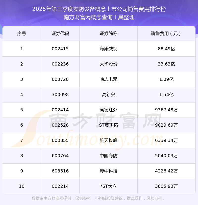 2025年第三季度,安防設(shè)備概念上市公司銷售費(fèi)用排行榜如下:海康威視(002415)的銷售費(fèi)用總額高達(dá)88.49億,大華股份(002236)和鳴志電器(603728)分別位居第二和第三,高新興(300098)、高德紅外(002414)、ST英飛拓(002528)、航天長(zhǎng)峰(600855)、中國(guó)海防(600764)、淳中科技(603516)、*ST大立(002214)分別進(jìn)入前十,其銷售費(fèi)用總額分別排名第4-10名。