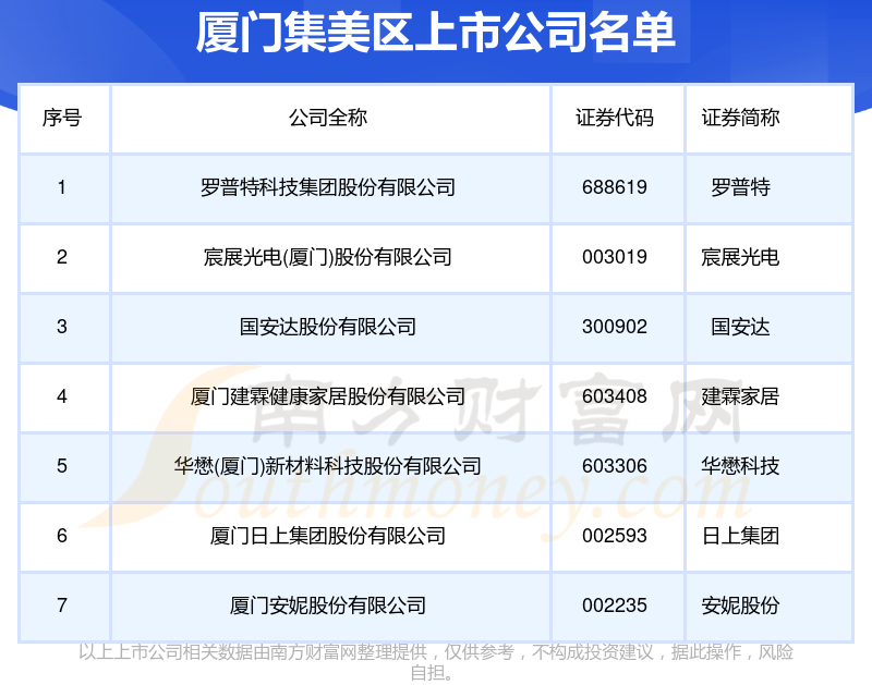 數(shù)量上來看,截至10月15日,廈門集美區(qū)共有7家A股上市公司。其中,上交所3家(華懋科技、建霖家居、羅普特等),深交所4家(安妮股份、日上集團(tuán)、宸展光電、國安達(dá)等)。