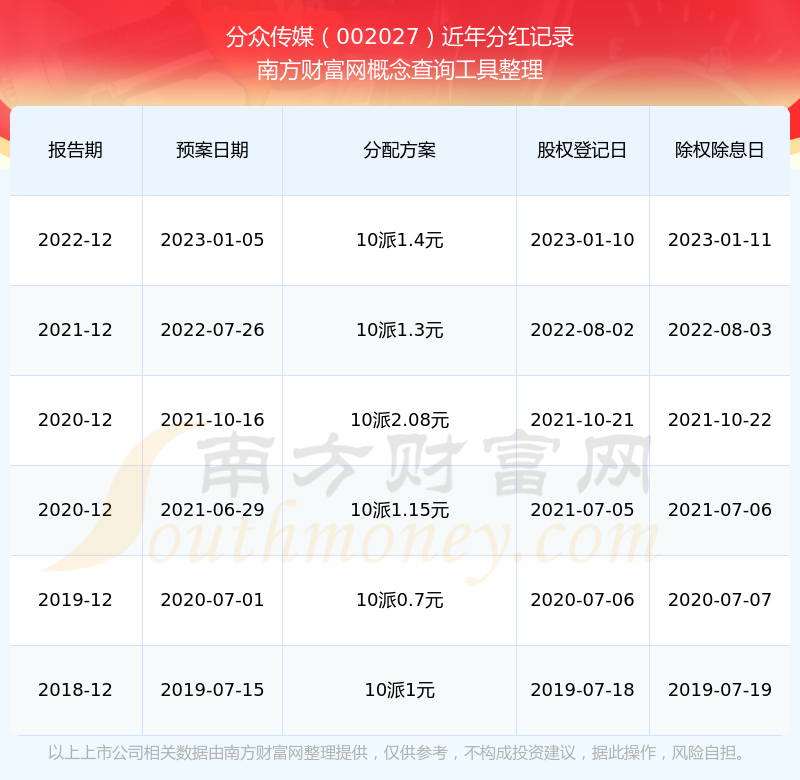 分眾傳媒最新一次公布的分紅方案為10派1.4元。本次權(quán)益分派股權(quán)登記日為2023年1月10日,除權(quán)除息日為2023年1月11日,派息日為2023年1月11日。