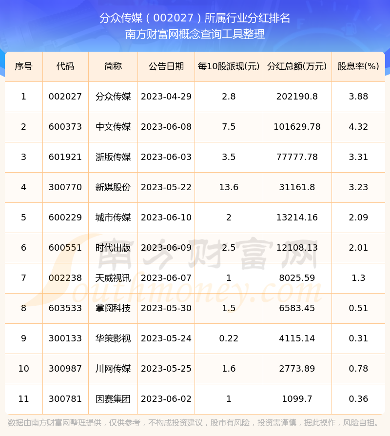 按照南方財(cái)富網(wǎng)趨勢(shì)選股系統(tǒng)統(tǒng)計(jì),分眾傳媒所屬行業(yè)為文化傳媒行業(yè),文化傳媒行業(yè)分紅排名情況如下表: