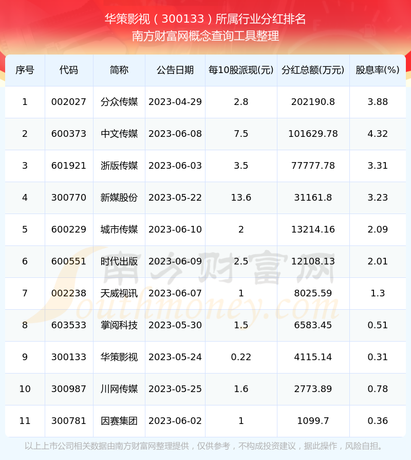按照南方財富網(wǎng)趨勢選股系統(tǒng)統(tǒng)計,華策影視所屬行業(yè)為文化傳媒行業(yè),文化傳媒行業(yè)分紅排名情況如下表: