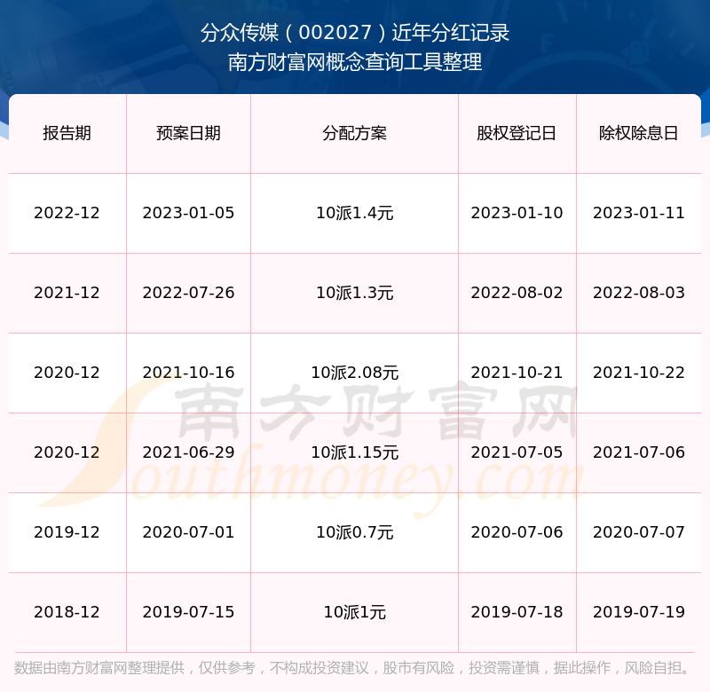 分眾傳媒最新一次公布的分紅方案為10派1.4元。本次權益分派股權登記日為2023年1月10日,除權除息日為2023年1月11日,派息日為2023年1月11日。