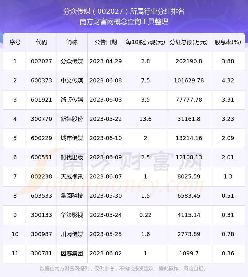 按照南方財富網(wǎng)趨勢選股系統(tǒng)統(tǒng)計,分眾傳媒所屬行業(yè)為文化傳媒行業(yè),文化傳媒行業(yè)分紅排名情況如下表: