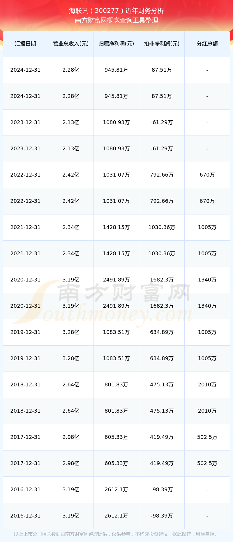 海聯(lián)訊歷年分紅派息情況如下表所示: