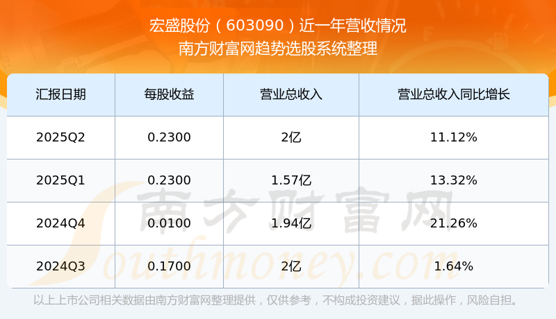 一、宏盛股份(603090)股票業(yè)績情況 宏盛股份披露了2025年第二季度財(cái)報(bào)。報(bào)告顯示,宏盛股份2025年第二季度實(shí)現(xiàn)營收2億元,同比11.12%;歸母凈利潤2232.18萬元,同比50.27%。 宏盛股份股票近一年?duì)I收情況如下表: 按照南方財(cái)富網(wǎng)概念查詢工具統(tǒng)計(jì),該股所屬