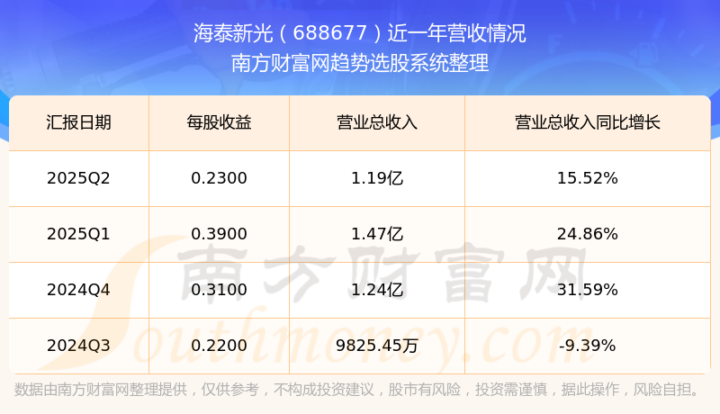 2025年第二季度,海泰新光營收同比15.52%,凈利潤同比-13.55%。