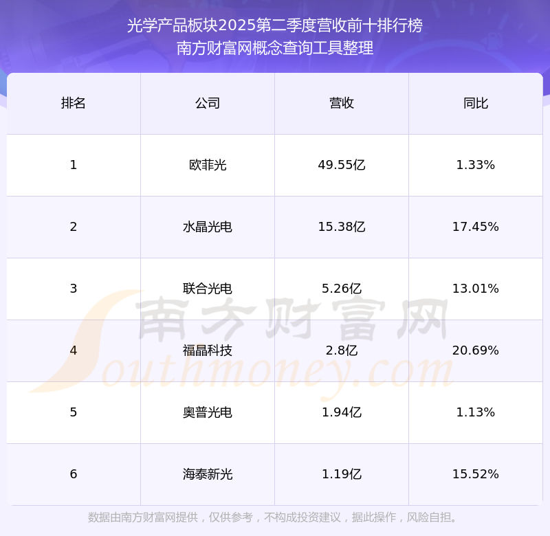 按照南方財(cái)富網(wǎng)概念查詢工具統(tǒng)計(jì),該股所屬板塊為光學(xué)產(chǎn)品板塊,該板塊共有6只股票,海泰新光2025第二季度營收在該板塊中排名為第6名,該板塊2025第二季度營收排名前十的股票如下表: