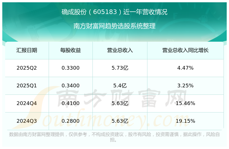確成股份(605183)披露2025年第二季度報告,報告期實現(xiàn)營收5.73億元,同比4.47%;歸母凈利潤1.38億元,同比-0.82%;扣非凈利潤1.38億元,同比3.57%。