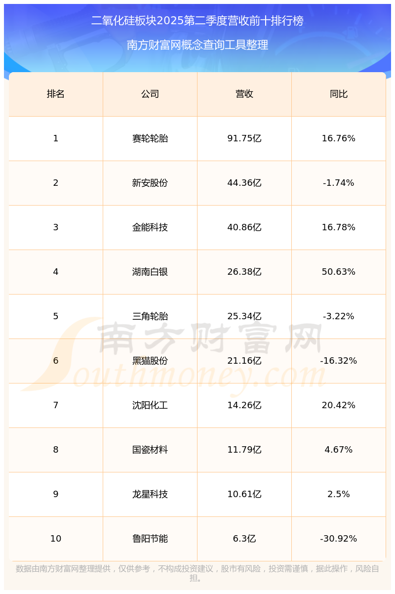 按照南方財富網(wǎng)概念查詢工具統(tǒng)計,該股所屬板塊為二氧化硅板塊,該板塊共有23只股票,確成股份2025第二季度營收在該板塊中排名為第12名,該板塊2025第二季度營收排名前十的股票如下表: