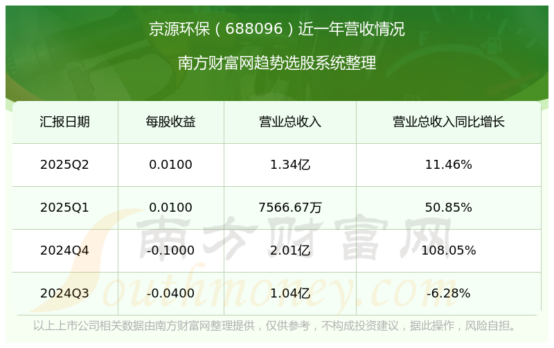 京源環(huán)保2025年第二季度財報顯示,公司主營收入1.34億元,同比11.46%;歸母凈利潤37.1萬元,同比-82.68%;扣非凈利潤-11.97萬元,同比-179.43%;