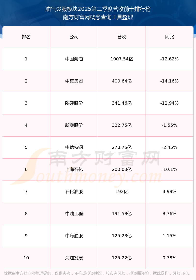 按照南方財(cái)富網(wǎng)概念查詢工具統(tǒng)計(jì),該股所屬板塊為油氣設(shè)服板塊,該板塊共有92只股票,深圳燃?xì)?025第二季度營收在該板塊中排名為第14名,該板塊2025第二季度營收排名前十的股票如下表: