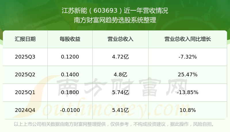江蘇新能2025年第三季度財報顯示,公司主營收入4.72億元,同比-7.32%;歸母凈利潤1.08億元,同比-17.54%;扣非凈利潤1.05億元,同比2.85%;