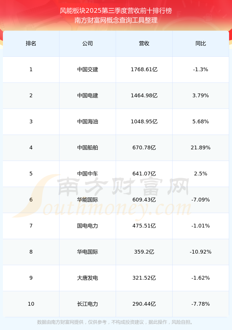 按照南方財富網(wǎng)概念查詢工具統(tǒng)計,該股所屬板塊為風(fēng)能板塊,該板塊共有243只股票,江蘇新能2025第三季度營收在該板塊中排名為第175名,該板塊2025第三季度營收排名前十的股票如下表: