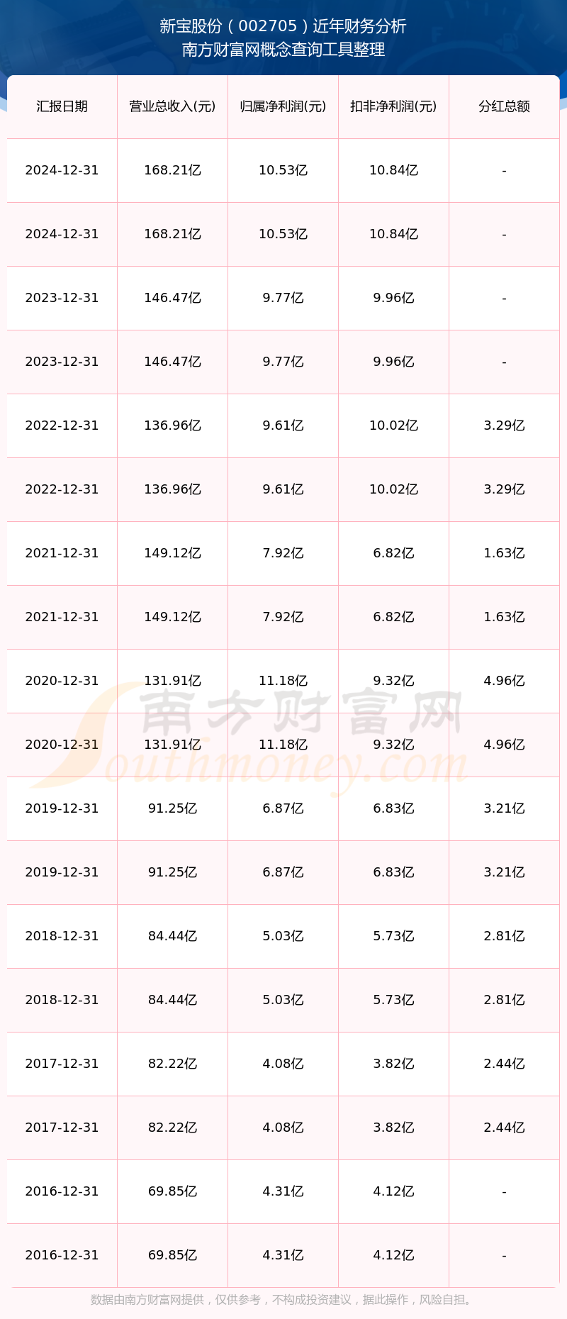 新寶股份最新一次公布的分紅方案為10派4元。本次權(quán)益分派股權(quán)登記日為2023年6月8日,除權(quán)除息日為2023年6月9日,派息日為2023年6月9日。